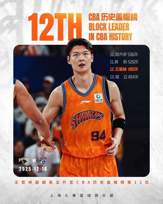 本賽季CBA常規(guī)賽第2輪,上海久事客場(chǎng)挑戰(zhàn)南京天之藍(lán)。王哲林在第二節(jié)送出個(gè)人第2次蓋帽,CBA生涯蓋帽總數(shù)上升至495次,超越易立的494次,升至CBA歷史蓋帽榜第12位。