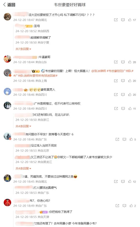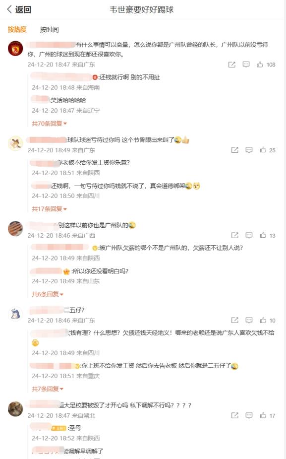 在韋世豪的微博評論區(qū)下充斥著兩種聲音,一種認為韋世豪當(dāng)初也是廣州隊隊長,有什么事可以商量,另一種則認為俱樂部欠債還錢天經(jīng)地義。你怎么看?