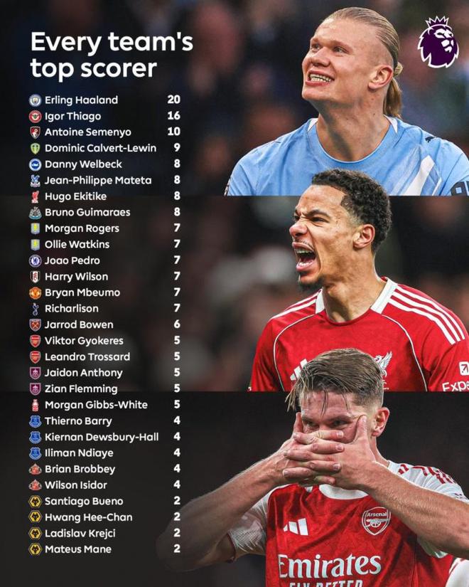 英超聯(lián)賽官方統(tǒng)計(jì)并公布了本賽季至今(截至當(dāng)前賽季階段)各支球隊(duì)在聯(lián)賽中的頭號(hào)射手。曼城的埃爾林·哈蘭德以20球遙遙領(lǐng)先,高居榜首。其他表現(xiàn)出色的球員包括布倫特福德的伊戈?duì)枴さ賮喐辏?6球)和伯恩茅斯的塞梅尼奧(10球)。